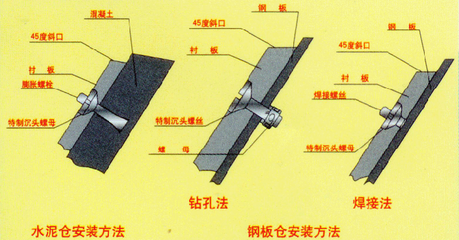 任何一種固定方法,設(shè)計時都應(yīng)考慮到有利于散裝物料的流動,并且螺釘頭母總是埋入襯板內(nèi)。